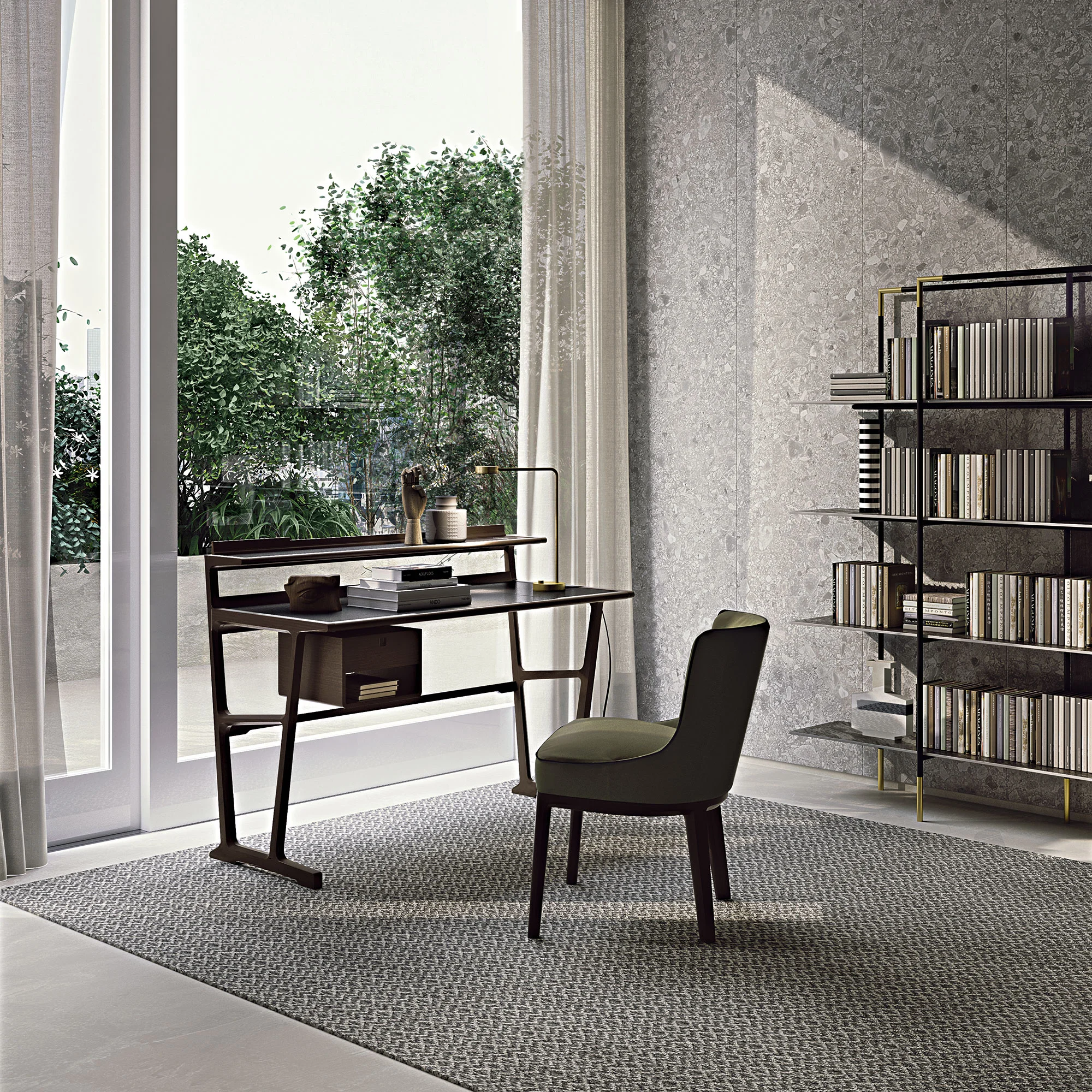 A confident hallmark for the sophisticated writing desk Archè which is defined by the solid wood structure with slanted cut and smoothed edges. Extremely cared in all details, the Archè writing desk features a top in precious hide leather with stitching tone-on-tone, contemporary reinterpretation of the “desk pad” of the traditional writing desks. The upper shelf is also covered in hide leather with integrated storage trays, another refined example of the tailoring attitude of Frigerio. The proposal of the Archè writing desk is enriched with a suspended element underneath the wooden top with a drawer and an open space.