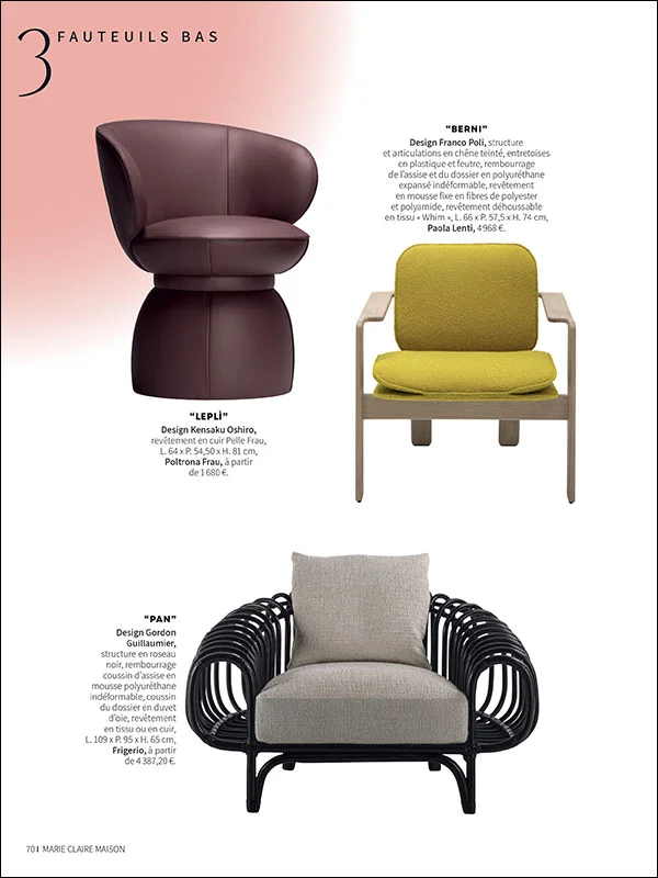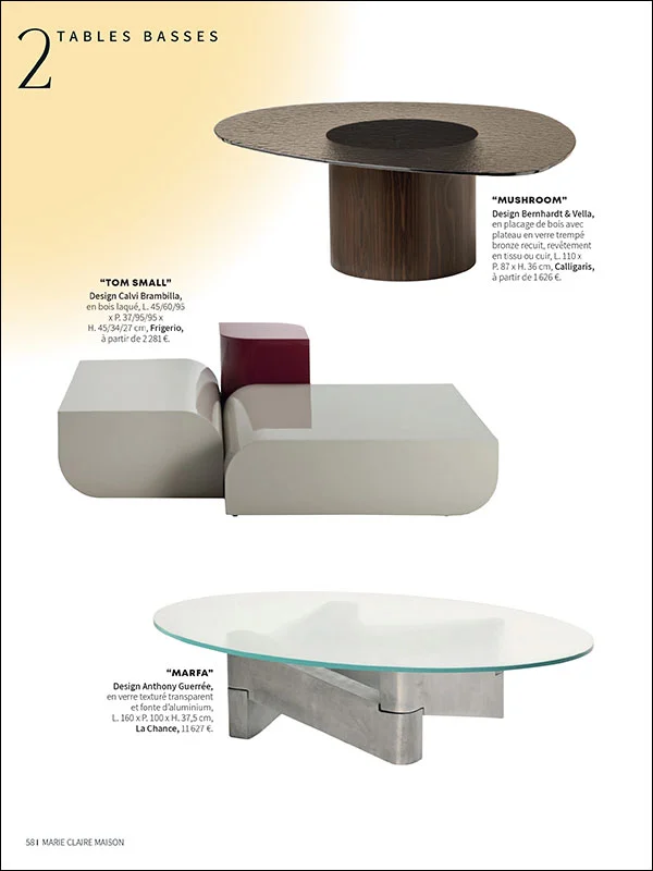 Discover the Tom small tables by CalviBrambilla and the Pan armchair by Gordon Guillaumier for Frigerio in the latest issue of Marie Claire Maison_FR, September 2025.