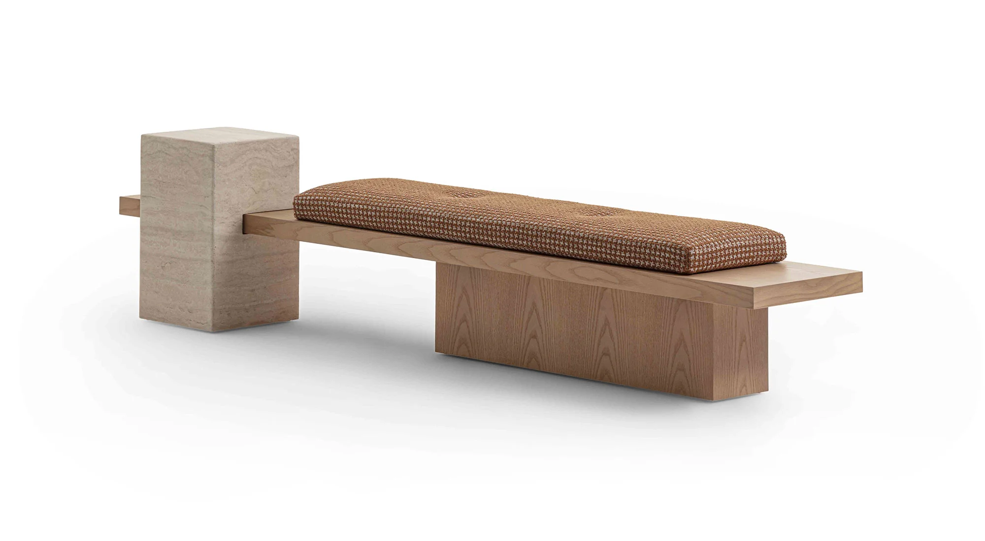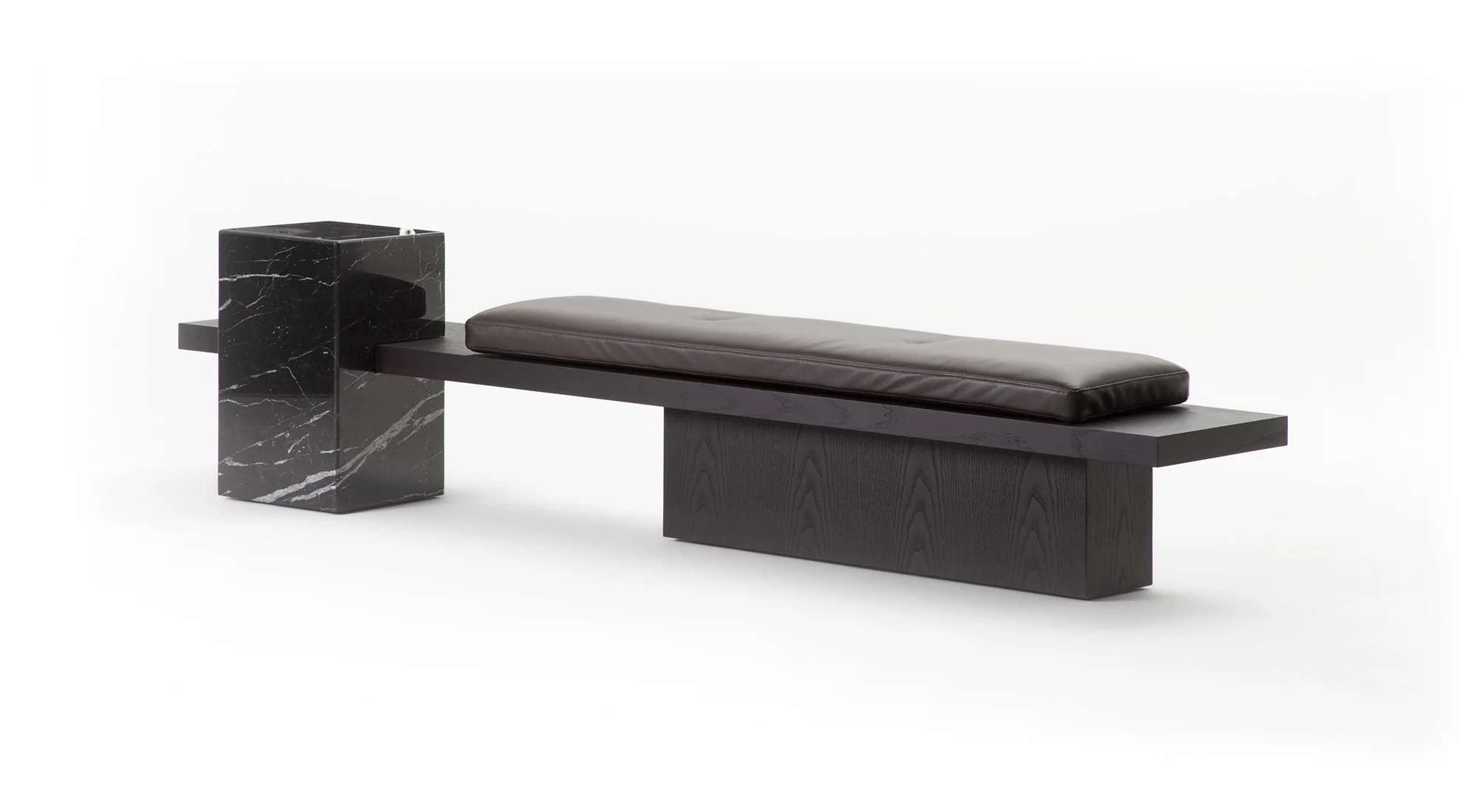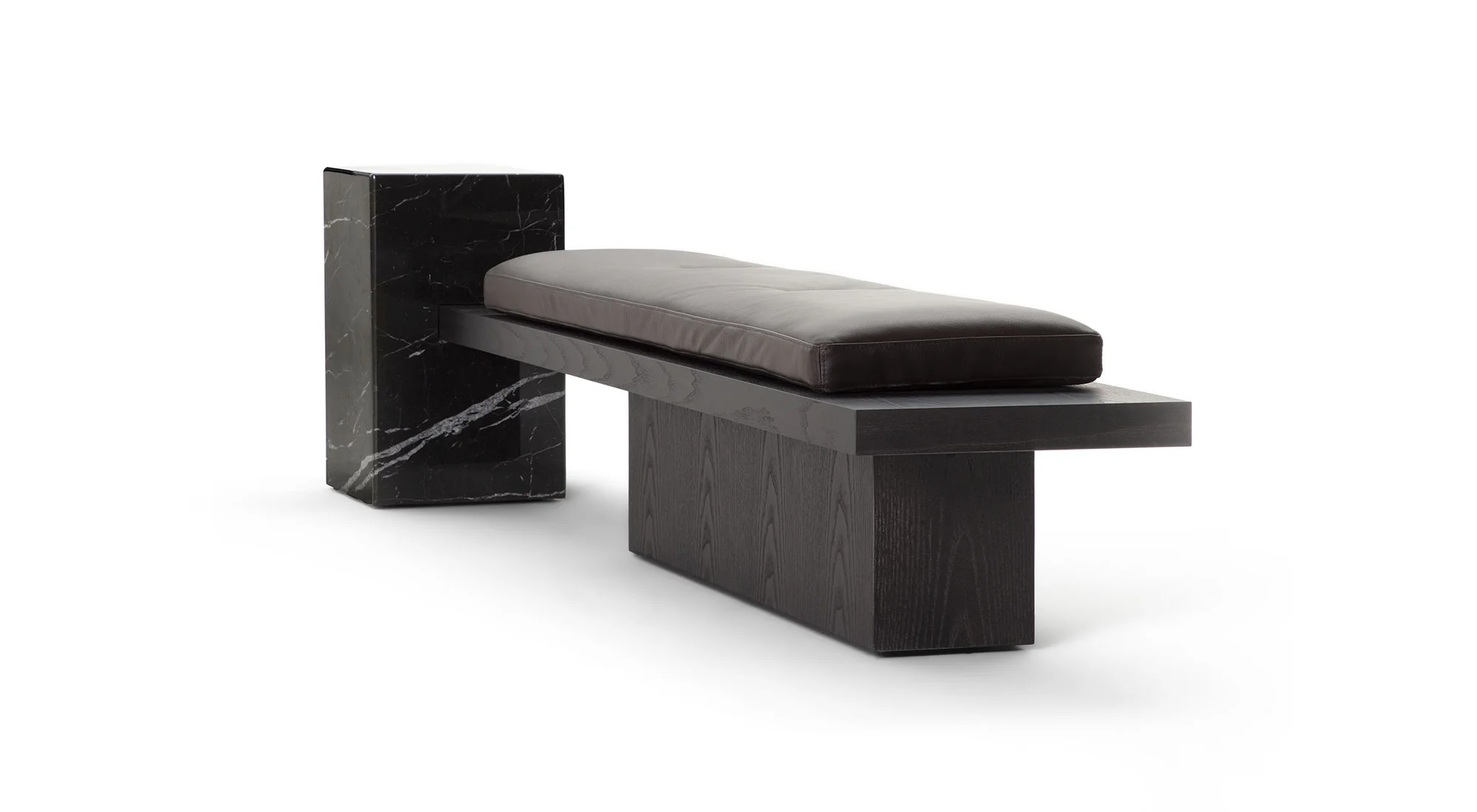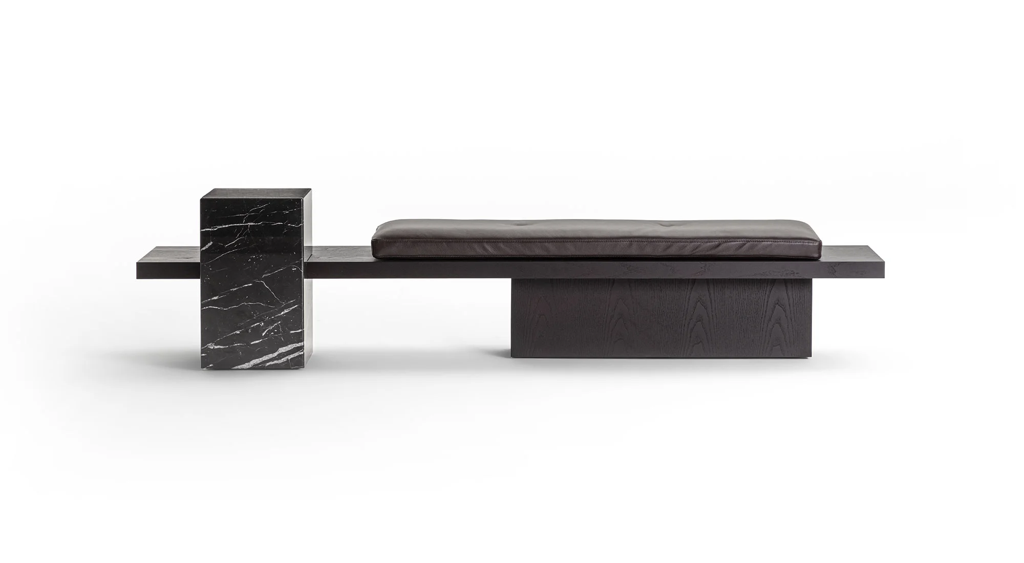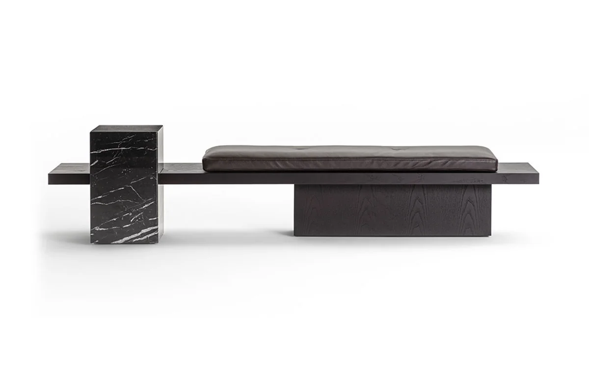Un ordine plastico e un senso di armonia caratterizzano la panca Metis. Essa si compone di una soffice materassina di puliuretano appoggiata su un piano e una gamba in legno in finitura frassino o in tutti i colori della collezione, in cui si inserisce deciso un volume monolitico in marmo ad incastro, nelle varianti Travertino, Rosso Levanto, Verde Levanto, Nero Marquina e Dark Emperador. Segno deciso, gioco di spessori e sapiente equilibrio tra gli elementi definiscono questa nuova seduta collettiva per la casa e il contract, accogliente e multimateriale.