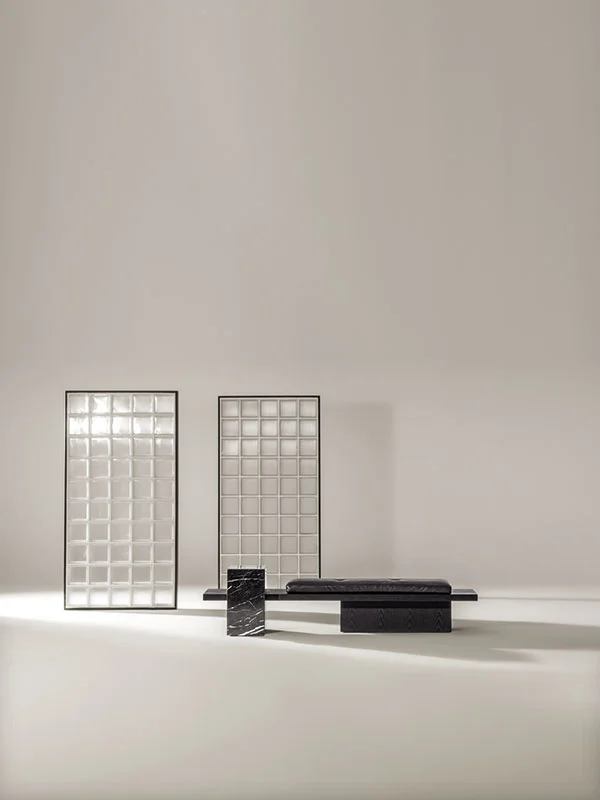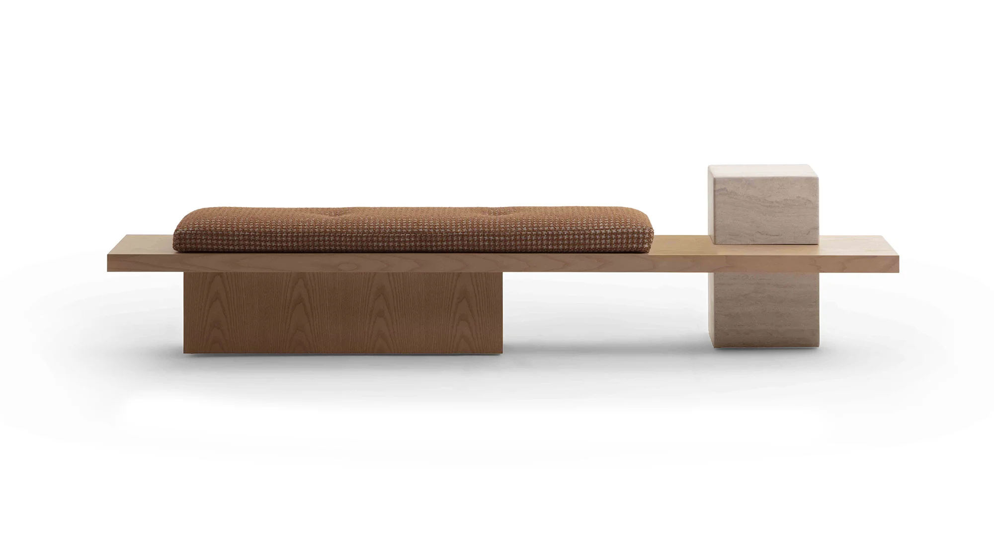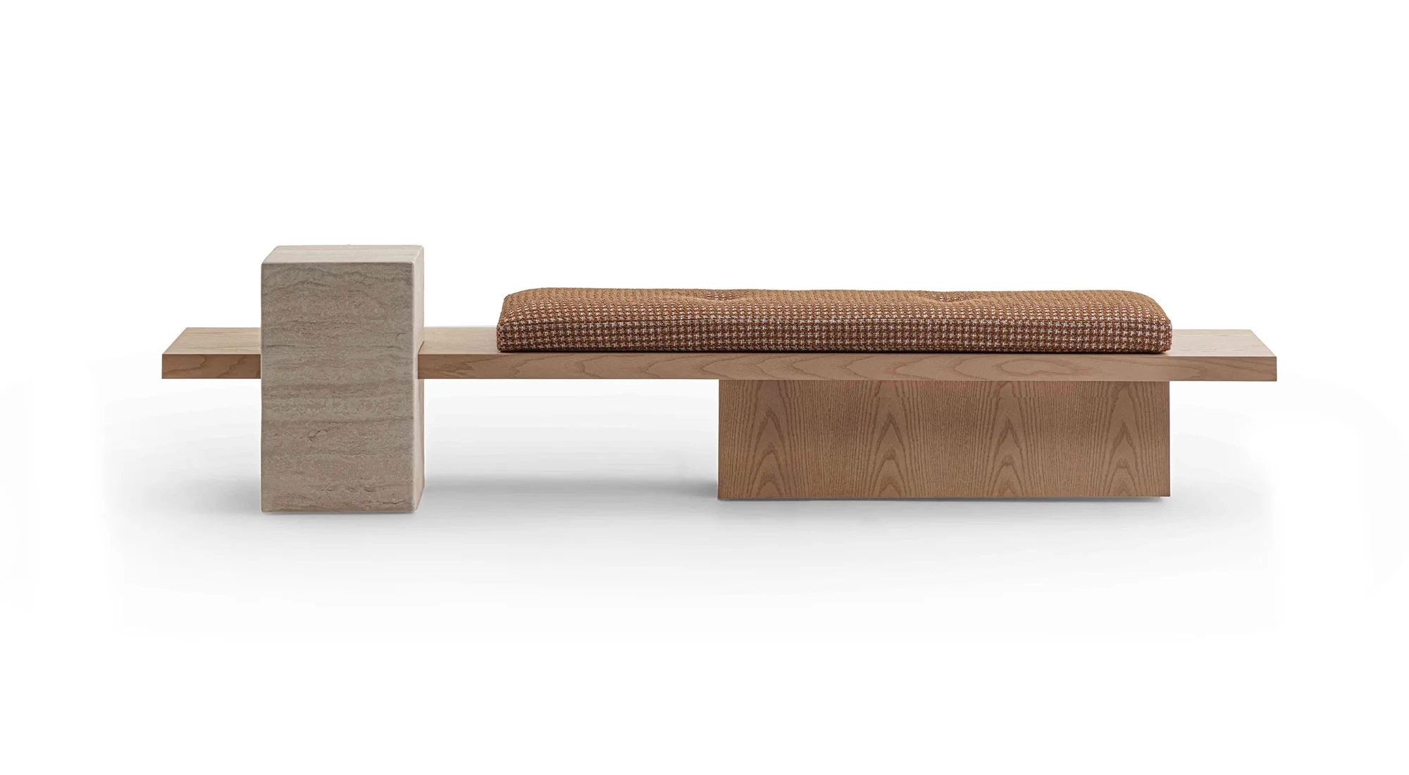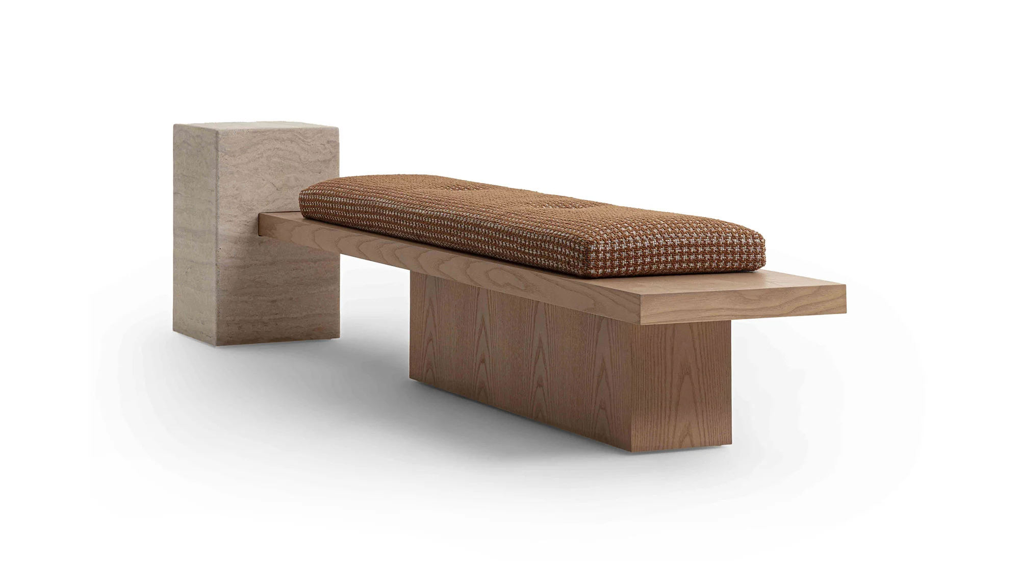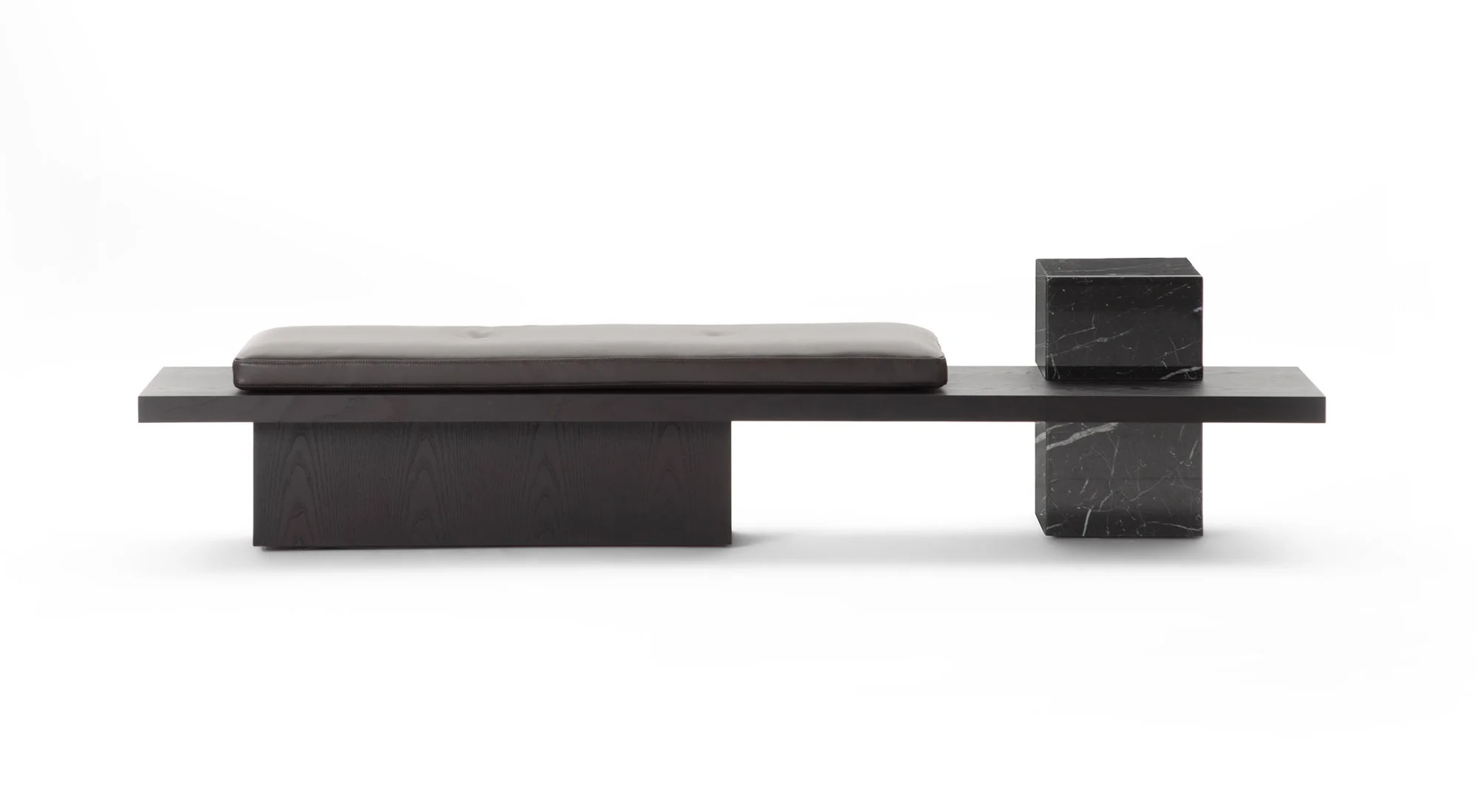 Un ordine plastico e un senso di armonia caratterizzano la panca Metis. Essa si compone di una soffice materassina di puliuretano appoggiata su un piano e una gamba in legno in finitura frassino o in tutti i colori della collezione, in cui si inserisce deciso un volume monolitico in marmo ad incastro, nelle varianti Travertino, Rosso Levanto, Verde Levanto, Nero Marquina e Dark Emperador. Segno deciso, gioco di spessori e sapiente equilibrio tra gli elementi definiscono questa nuova seduta collettiva per la casa e il contract, accogliente e multimateriale.