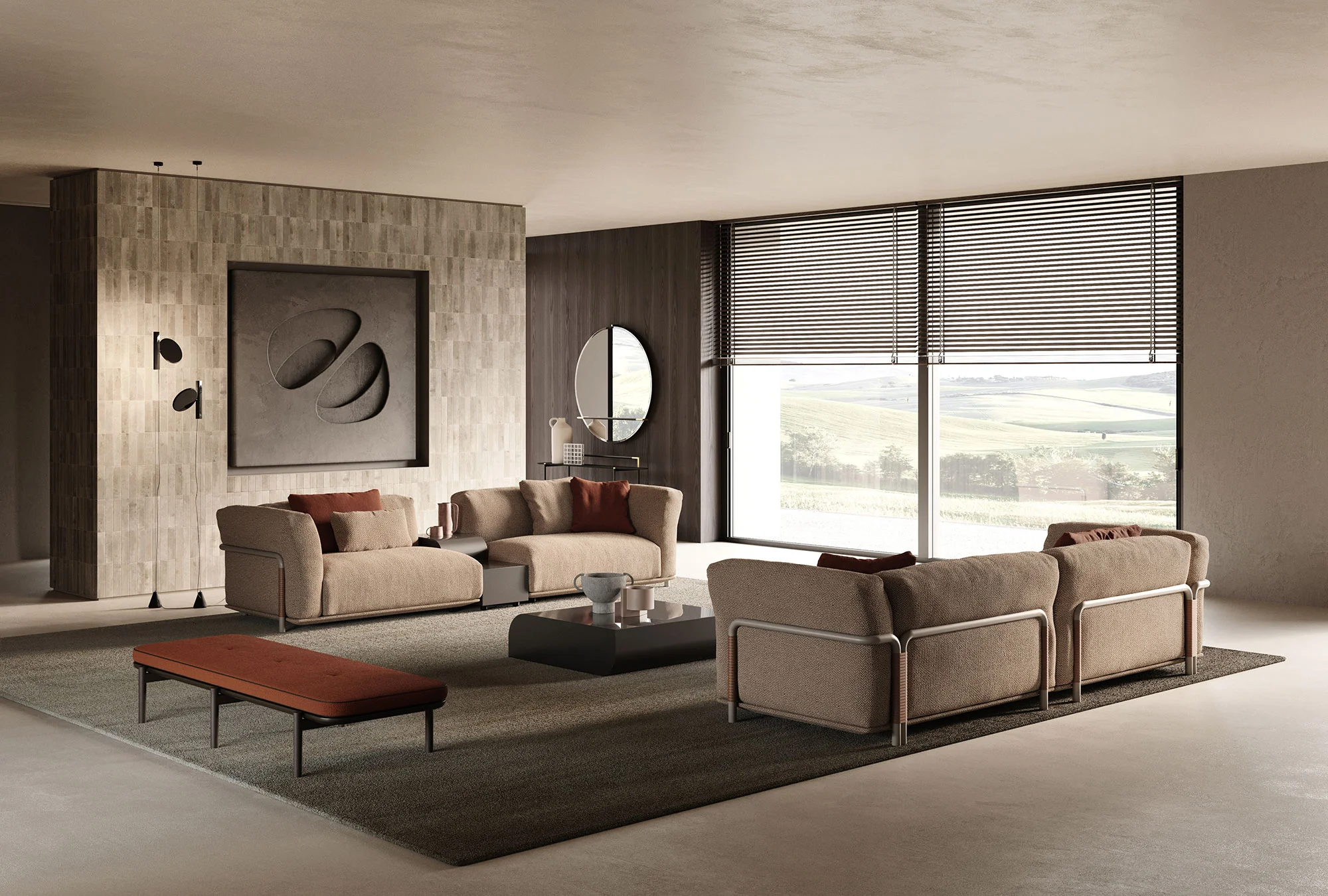 Struttura esterna: in metallo color Nero Sablé, color Sabbia Sablé, color Greige Sablé; su richiesta color Brunito, color Burgundy Sablé e color Titanio.