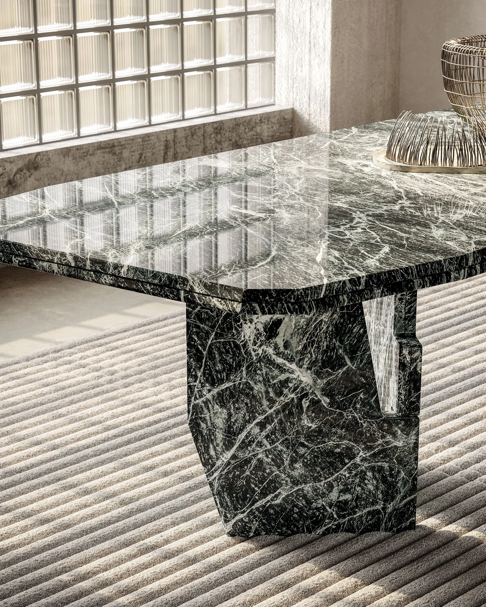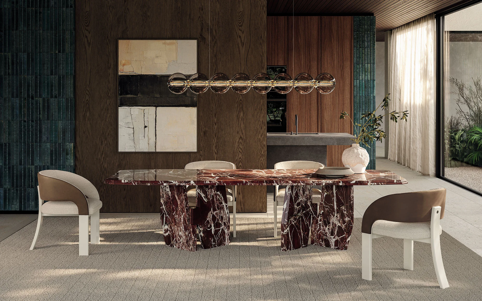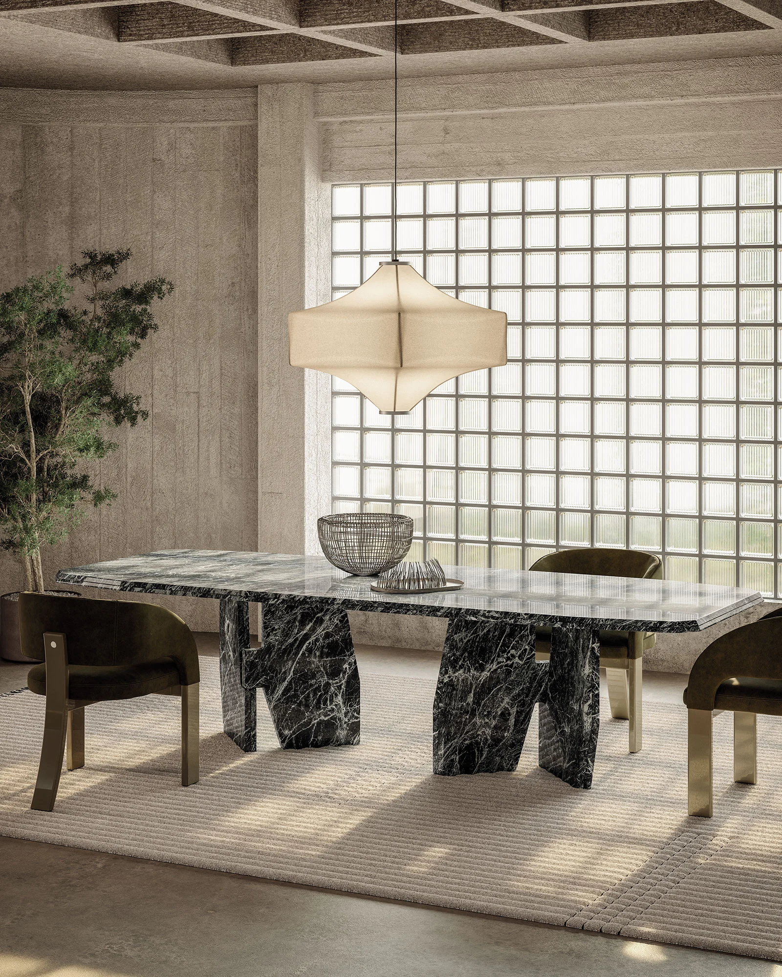 Rigore razionale, leggerezza percettiva e precisione del dettaglio: il nuovo tavolo Kumo disegnato da Calvi Brambilla presenta un piano rettangolare con spigoli smussati e una doppia base, costituita da due elementi di sostegno ancorati da un giunto. Astrazione organica e presenza plastica caratterizzano il progetto, che vive del contrasto dinamico tra massa e vuoto, equilibrio e tensione, in un dialogo continuo tra forme autonome. Disponibile in tutti i marmi della collezione Frigerio, Kumo riempie lo spazio come una danza, evocando le forme fluide e i colori audaci delle sculture di Calder ed Henry Moore.